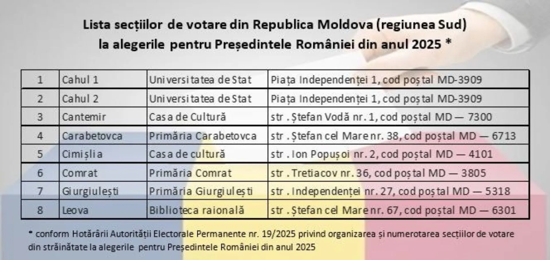 64 de secții de votare vor fi organizate pe teritoriul Republicii Moldova pentru alegerile prezidențiale din România. Cetățenii români aflați în Republica Moldova își vor putea exercita dreptul de vot în perioada două – patru mai.