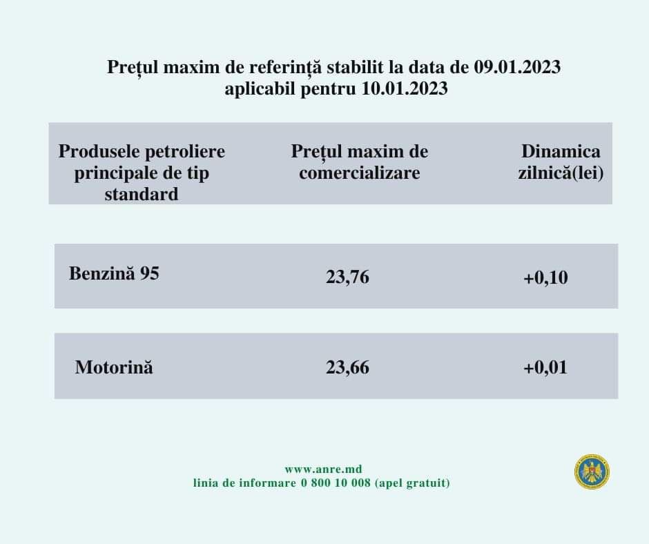 Astfel, potrivit ANRE, conducătorii auto vor scoate mâine din buzunar pentru un litru de benzină cu cifra octanică A-95 – 23,76 lei, cu 10 bani mai mult decât astăzi.