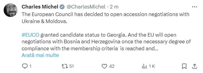 Consiliul European a decis deschiderea negocierilor de aderare la UE cu Moldova si Ucraina. Cel puțin asta a scris, într-un mesaj pe rețelele sociale, Charles Michel.