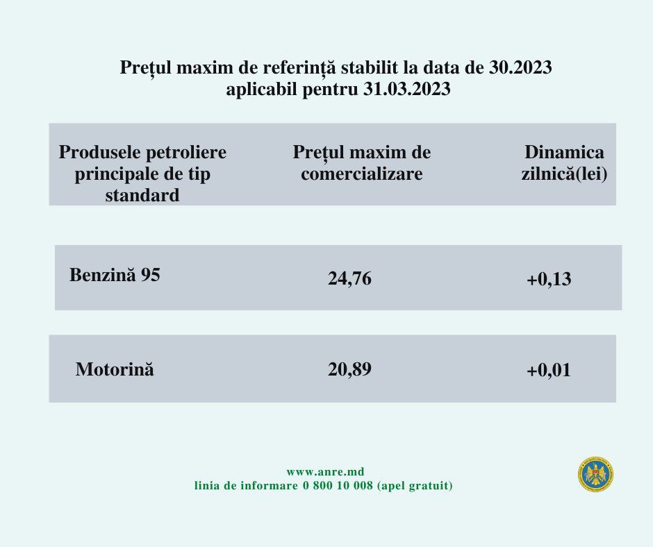 Astfel, potrivit ANRE, conducătorii auto vor scoate din buzunar pentru un litru de benzină cu cifra octanică A-95 – 24,76 de lei, cu 13 bani mai mult decât au plătit astăzi.