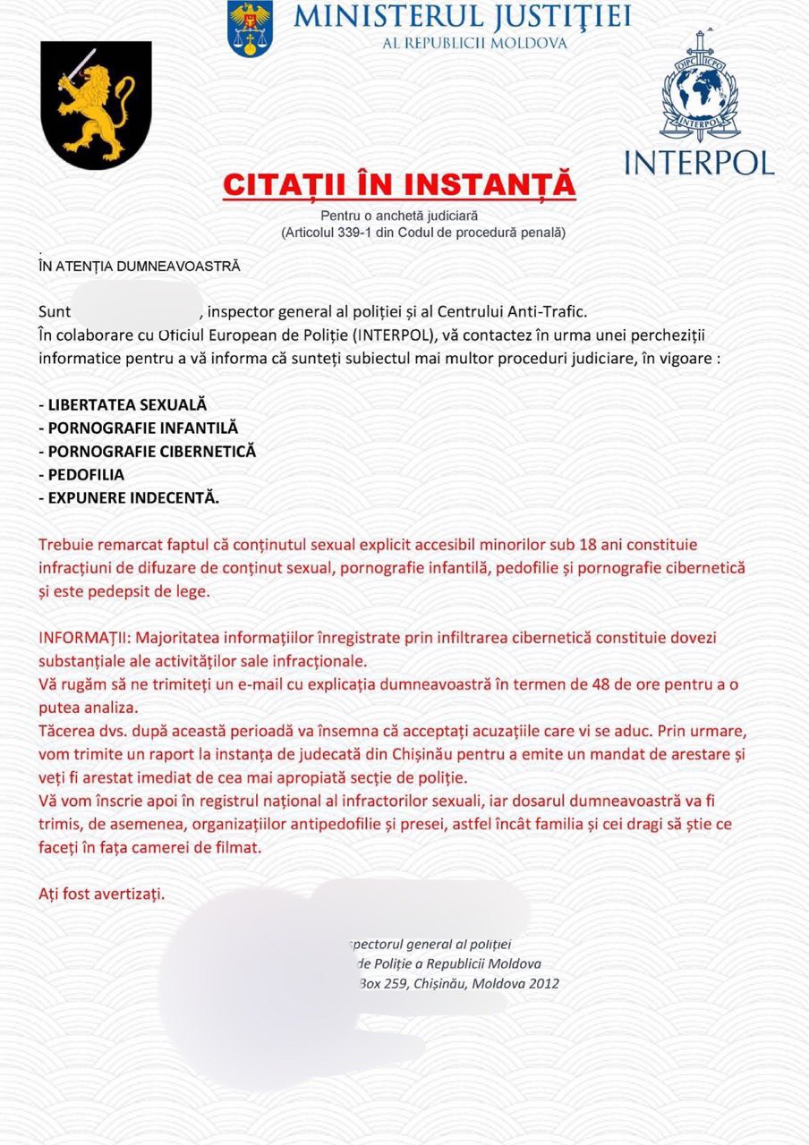Persoanele primesc mesaje pe poștă despre faptul că expeditorul ar avea în posesie imagini compromițătoare în care destinatarul ar fi implicat, iar pe cauza respectivă ar fi o declanșată o cercetare penală. Pentru încetarea investigării, iarăși sunt cerute sume de bani.