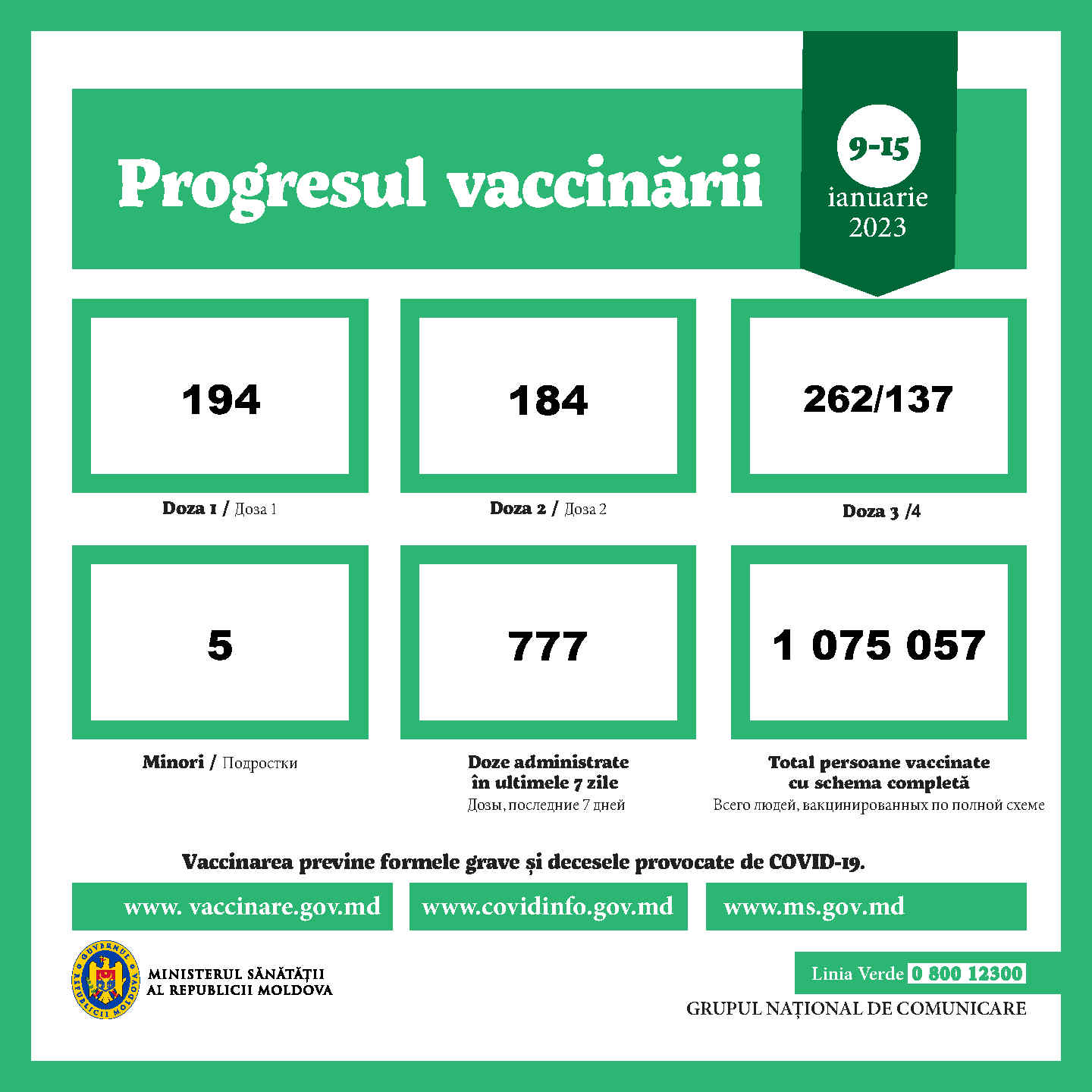 În același timp, 194 de cetățeni s-au imunizat cu doza I, iar alți 184 – cu doza a II-a a vaccinului anti-COVID-19. Astfel, în intervalul respectiv de timp, au fost administrate aproximativ 770 de doze de vaccin, dintre care numai cinci la minori. În total, autoritățile anunță că au fost imunizați, până în prezent, puțin peste 1.075.050 de moldoveni.