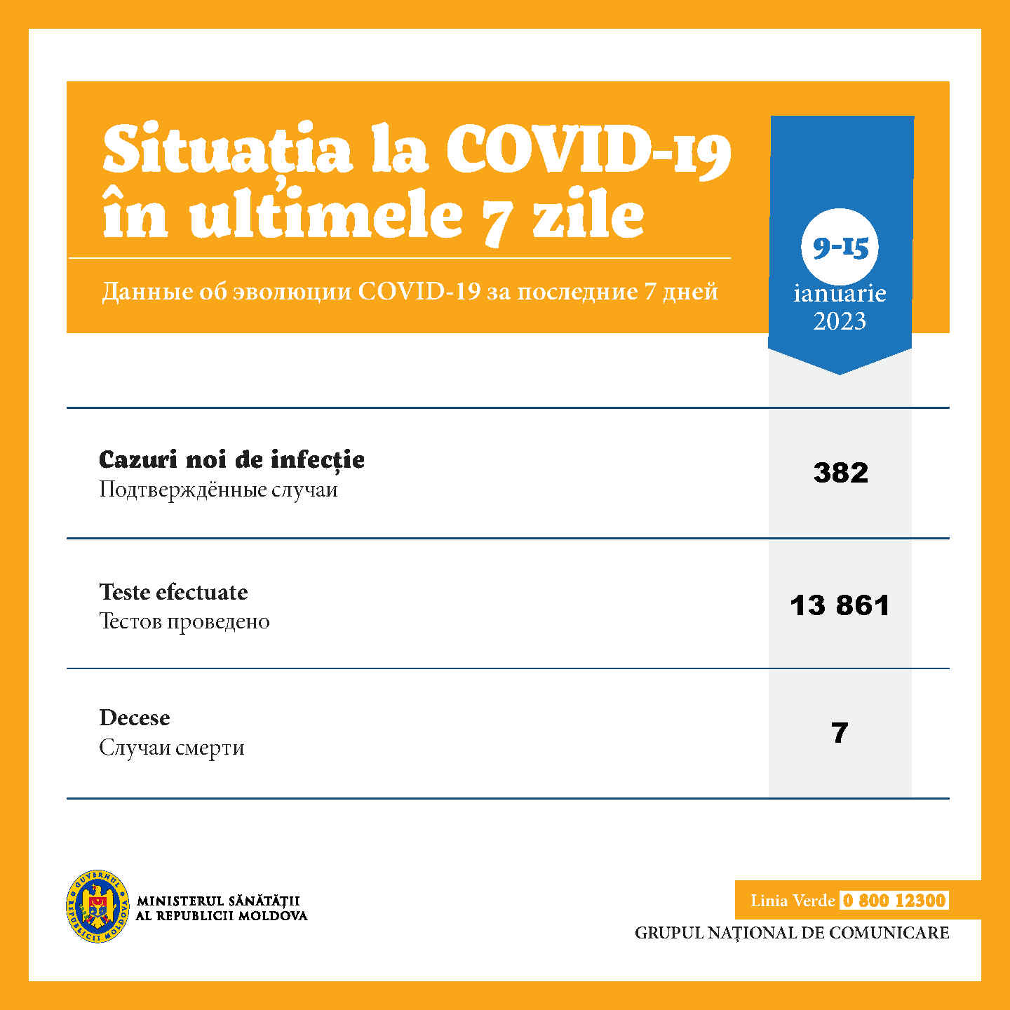 În ultima săptămână, 382 de cazuri pozitive COVID-19 au fost raportate în Moldova, potrivit datelor actualizate ale Ministerului Sănătății, cu privire la situația epidemiologică care s-a înregistrat în perioada 9 – 15 ianuarie pe întreg teritoriul țării, în urma a peste 13.800 de teste efectuate.