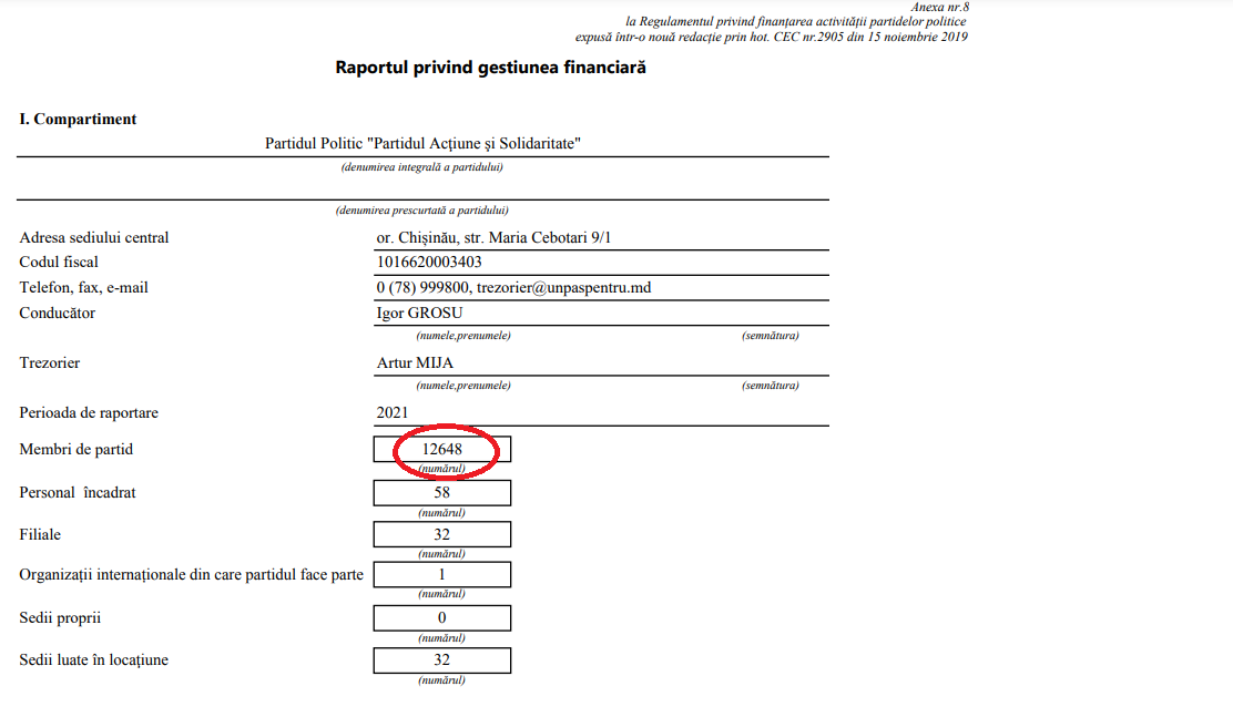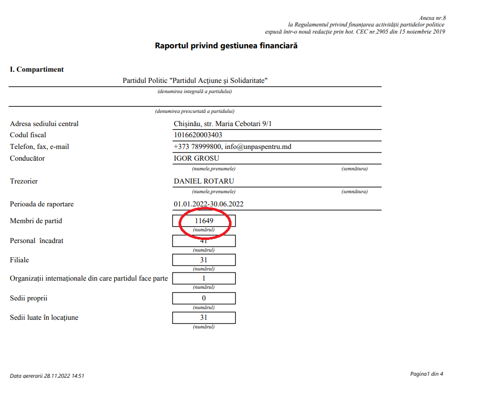 E de menționat și că, la 30 iunie curent, în raportul privind gestiunea pentru prima jumătate a anului 2022, a fost indicat că formațiunea are 11 649 de membri, respectiv în ultimele 5 luni la partid ar fi aderat 191 persoane.